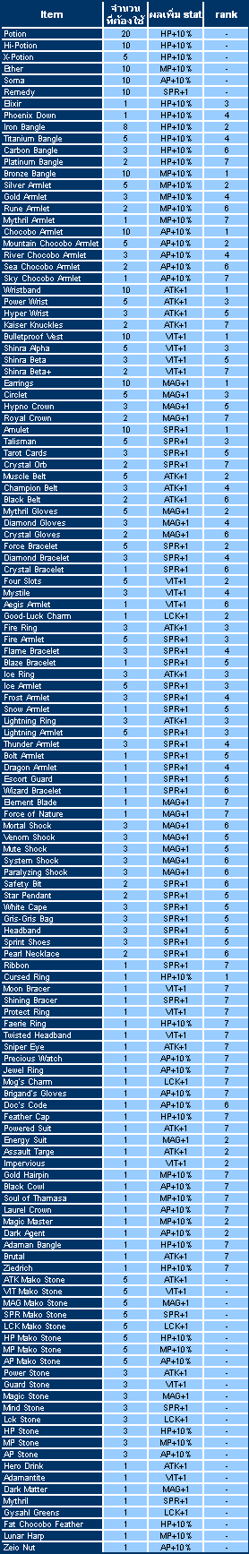 สามารถตรวจสอบแรงค์และค่าเพิ่ม stat ของไอเท็มได้จากตาราง