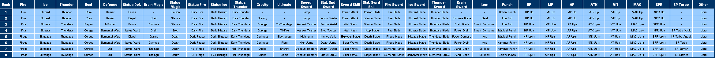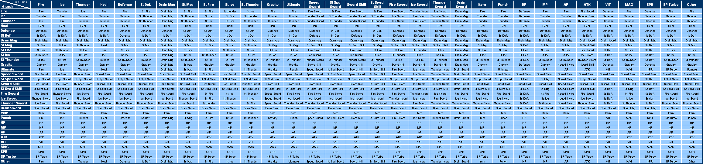 1. Assault Twister (Master, ATK+40) + Dual Cast (Master, MP+60%) 2. Drainga (Master, HP+999%) + VIT Up++ (Master, VIT+19) + Zeio Nut x1 3. Thundaga Blade (lv.1, MAG+2) + Magical Punch (lv.1, HP+60%) + Elixir x3 4. SPR Up+ (Master, SPR+12) + Stop Blade (Master, ATK+60) + Dark Matter x22 5. Stop Blade (Master, ATK+60) + VIT Up++ (Master, VIT+19) + Shinra Beta x11